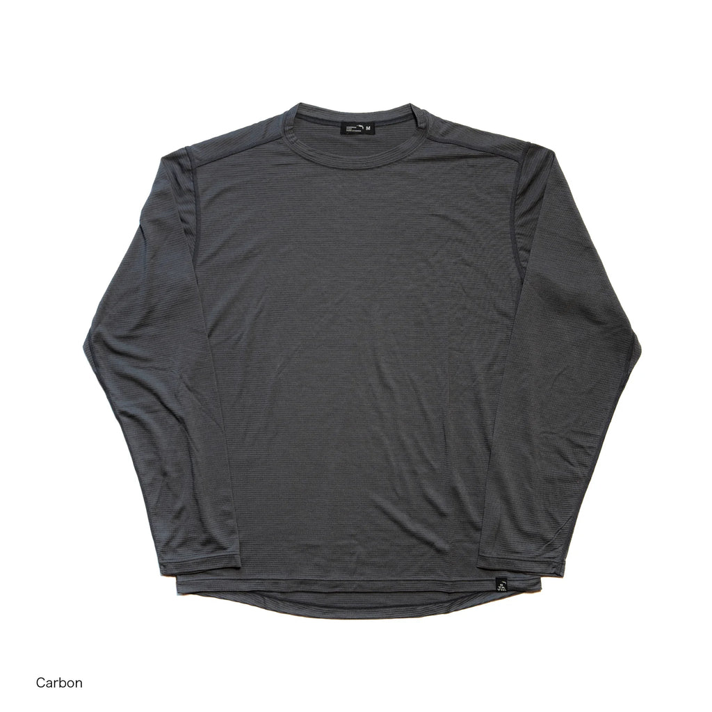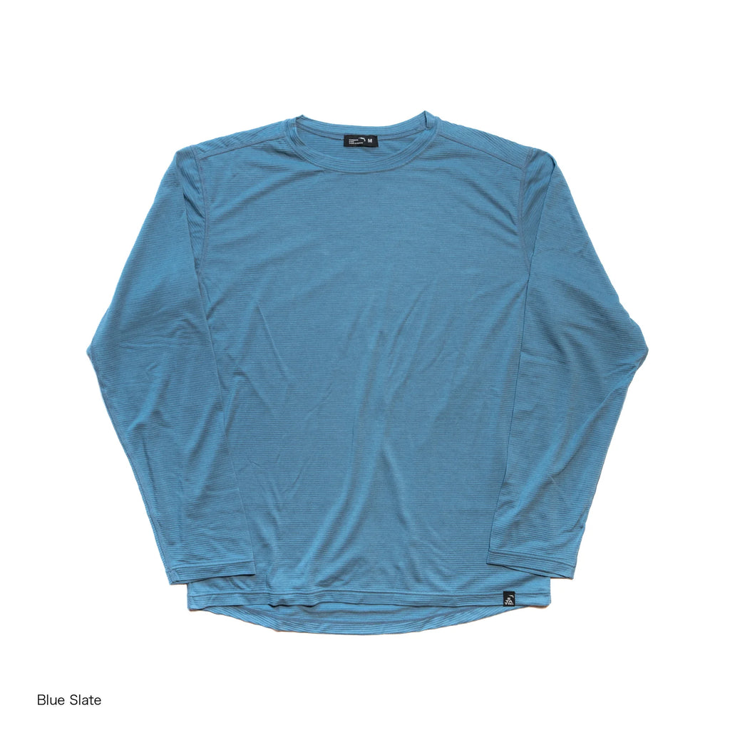 凹凸のあるボーダーメッシュ構造により高い通気性とリサイクルポリエステル糸で速乾性を高めます。 ウインドシェルを羽織ればさらに保温性が高まるため、インナーとしてもそれ単体でも活躍するアイテムです。