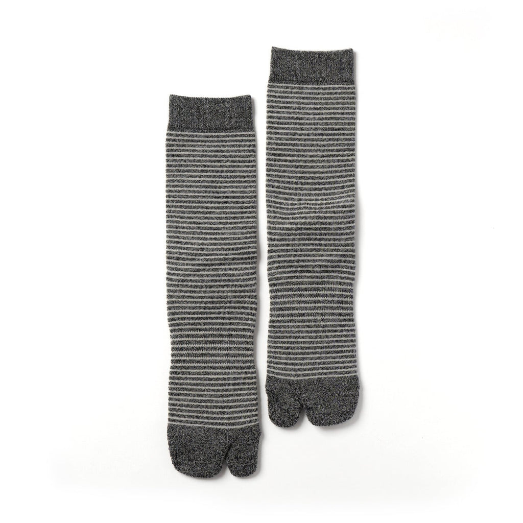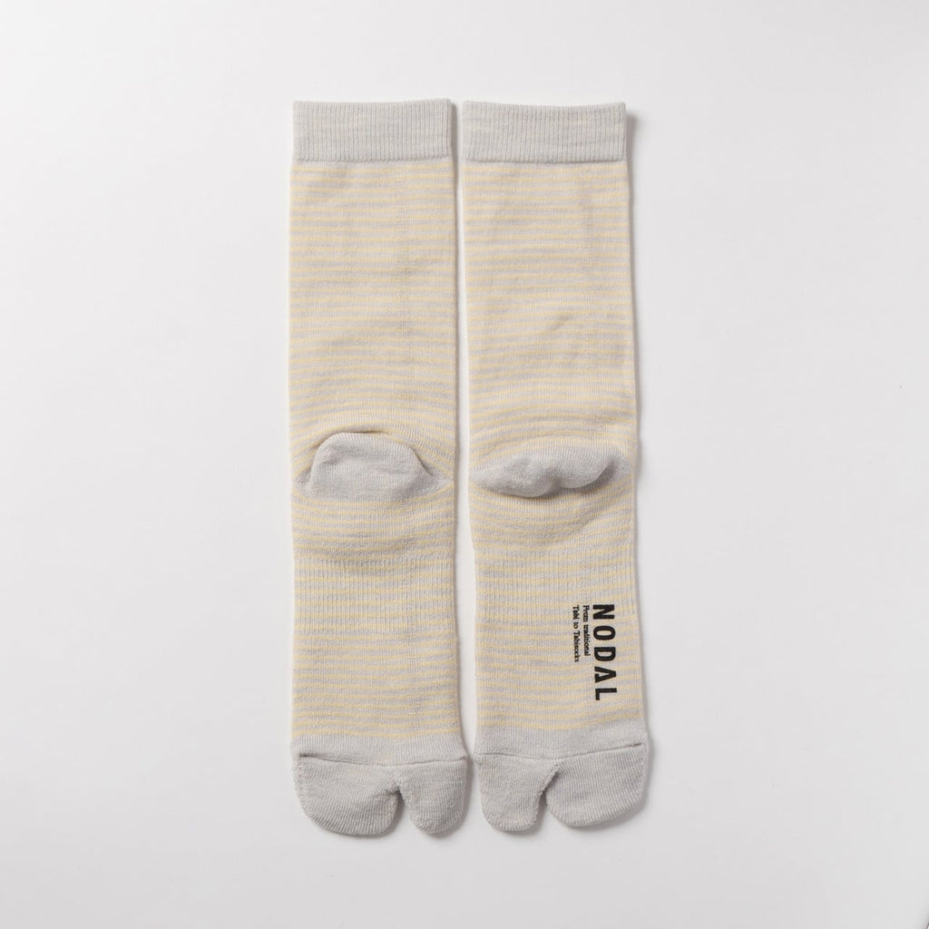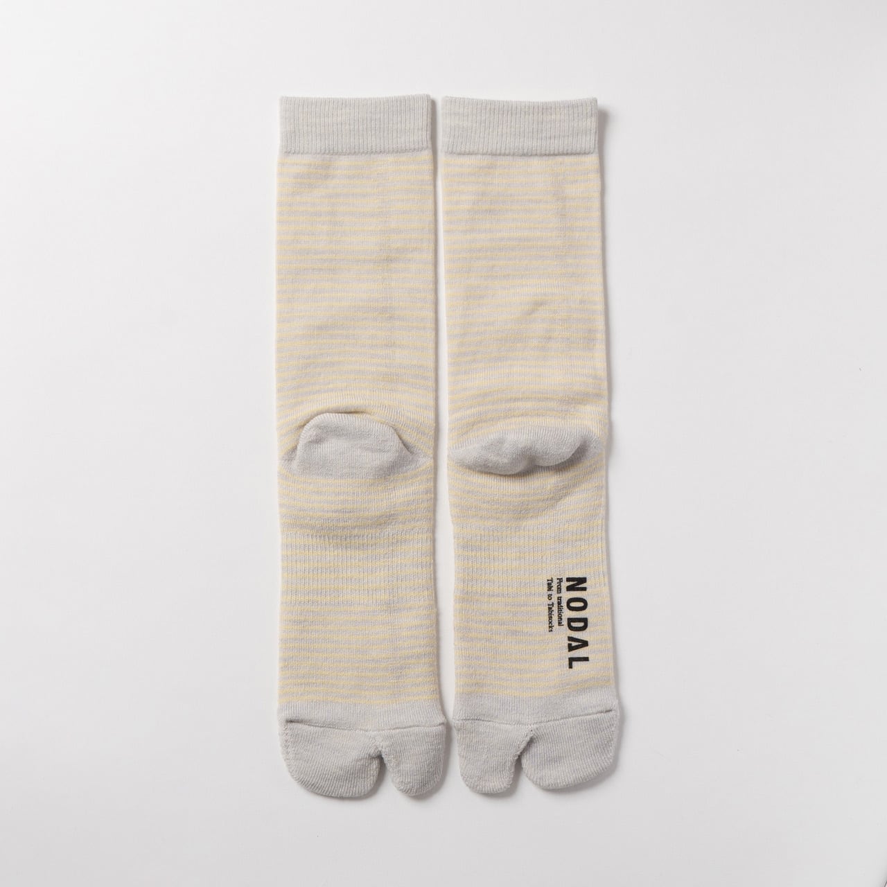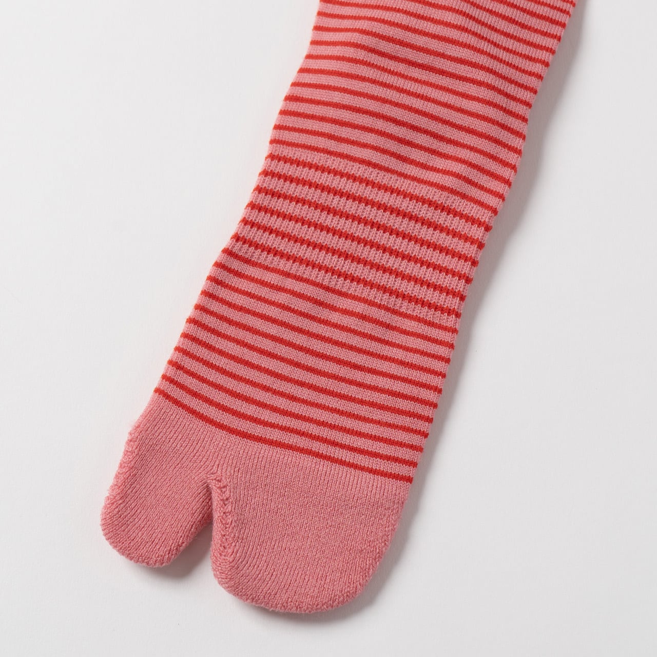 やや細めのボーダー柄が足元のアクセントになる1足。足底はパイル編みでクッション性があり、甲部分にはサポートゴムを編み込んでいるのでズレにくく安定した履き心地です。