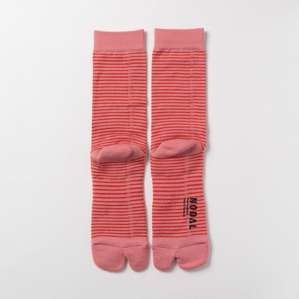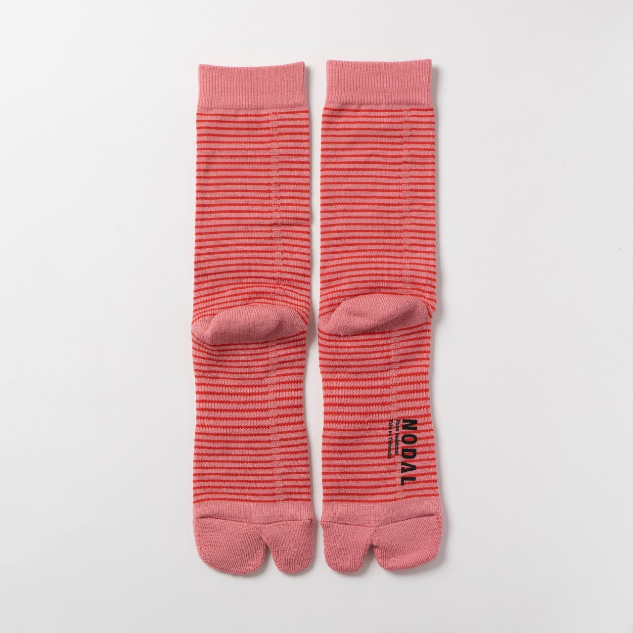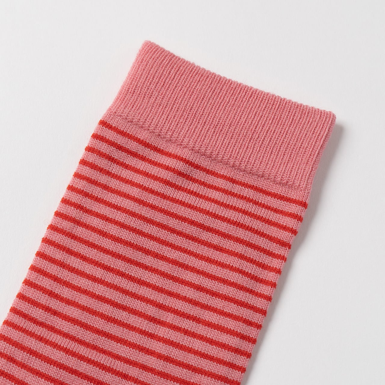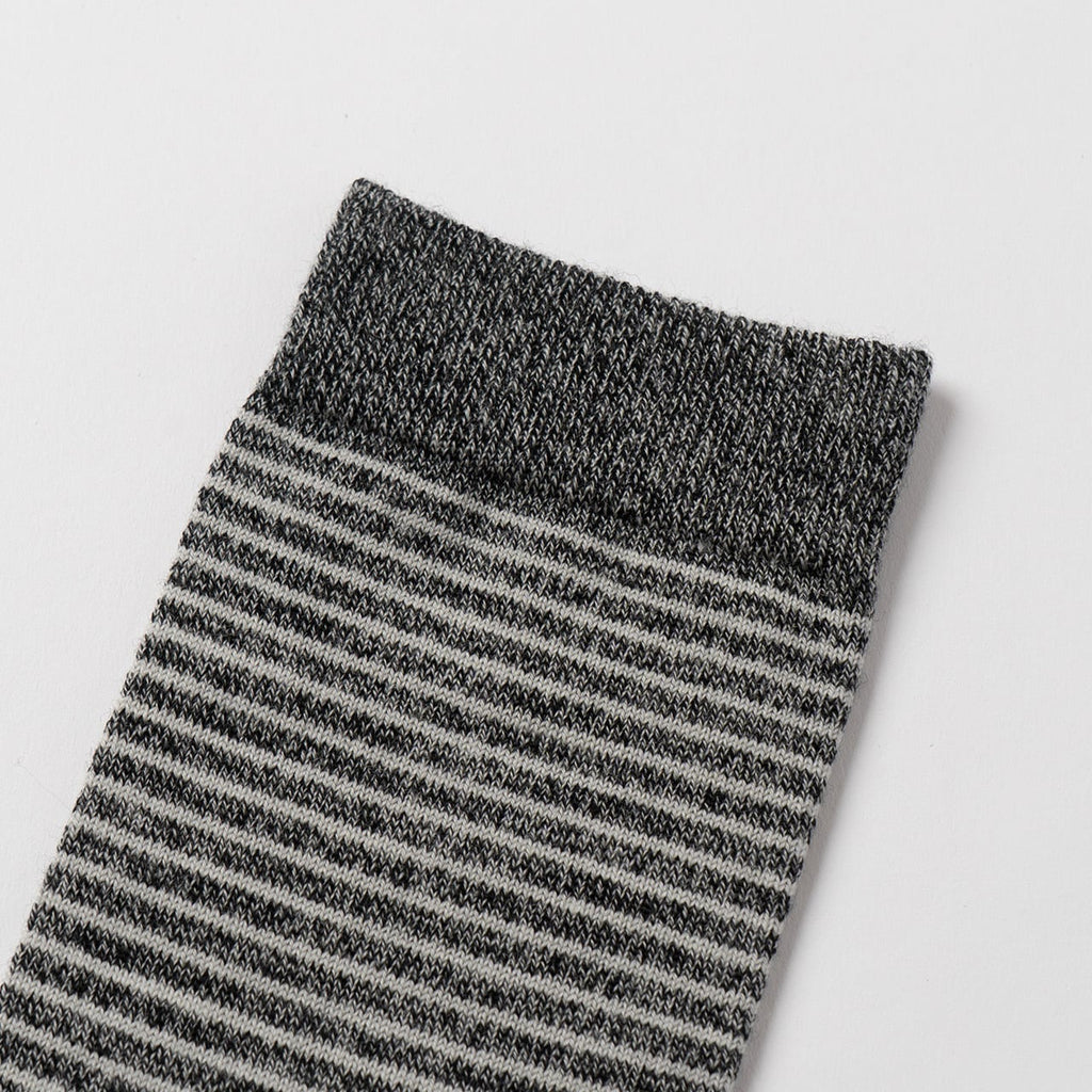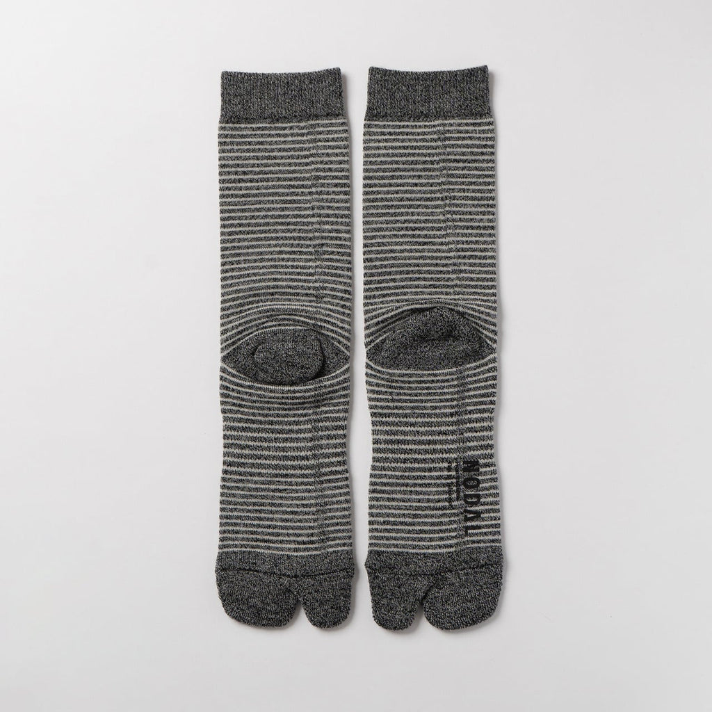 やや細めのボーダー柄が足元のアクセントになる1足。足底はパイル編みでクッション性があり、甲部分にはサポートゴムを編み込んでいるのでズレにくく安定した履き心地です。