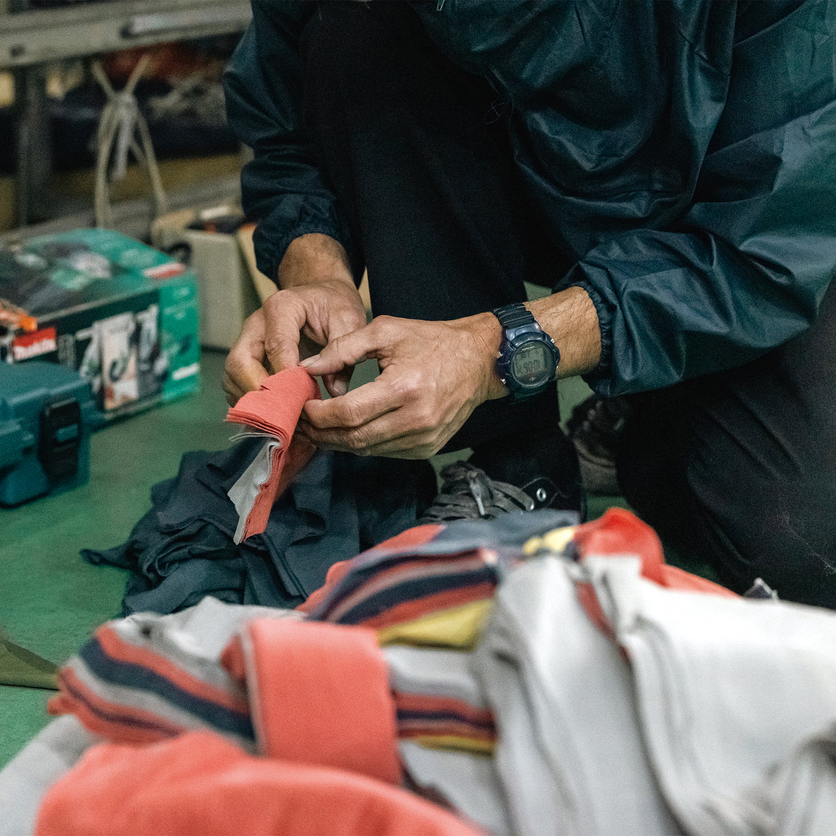 ・Management of cut pieces by changing the usual routine (disposal) in sewing factories ・Time-consuming factory work to separate cut pieces and remove waste ・Shrink-proofing virgin yarn ・Yarn spinning from recycled and virgin fibers ・Whole garment manufacturing