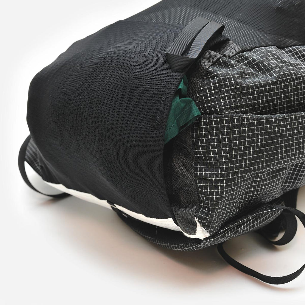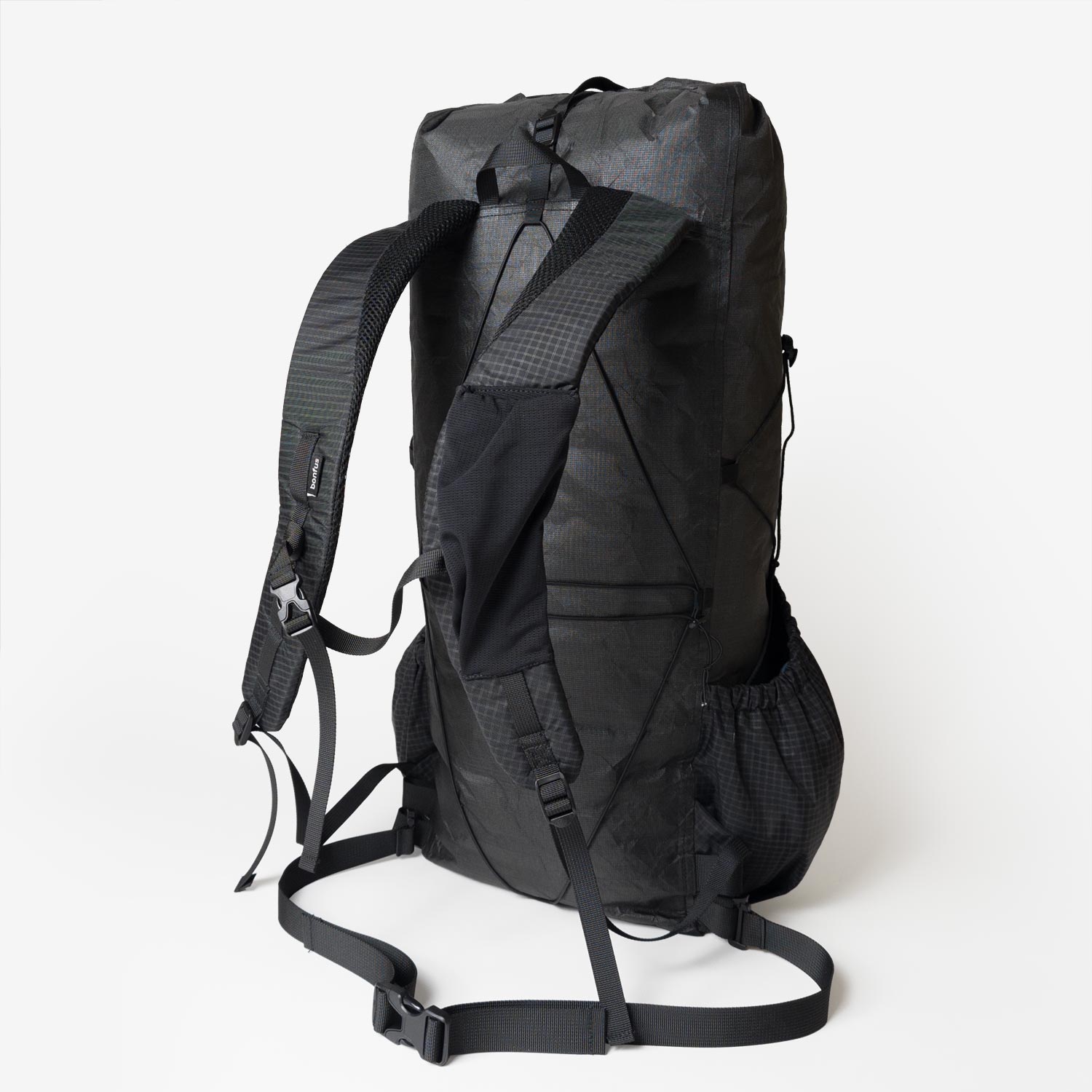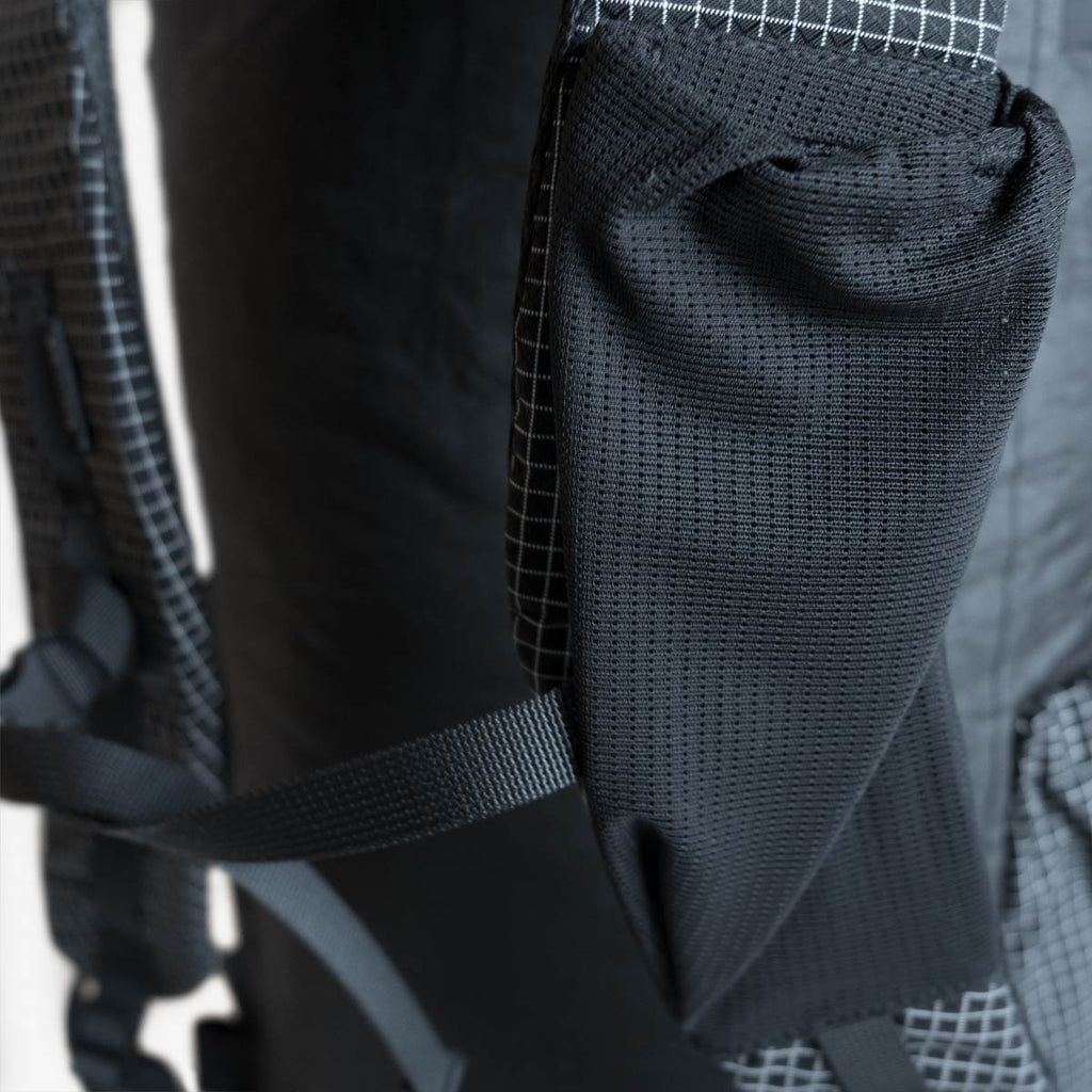 The pack is made with cutting-edge waterproof materials, resulting in an extremely lightweight and durable pack. The left shoulder harness has a highly stretchable mesh pocket, perfect for storing snacks or a smartphone. There is also a pocket at the bottom (access opening is on the right).