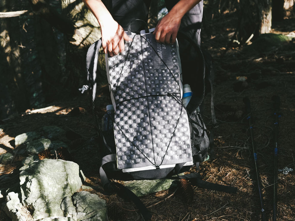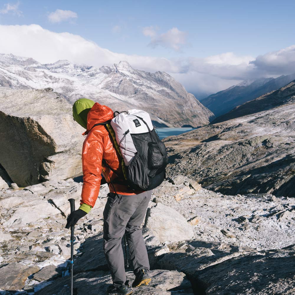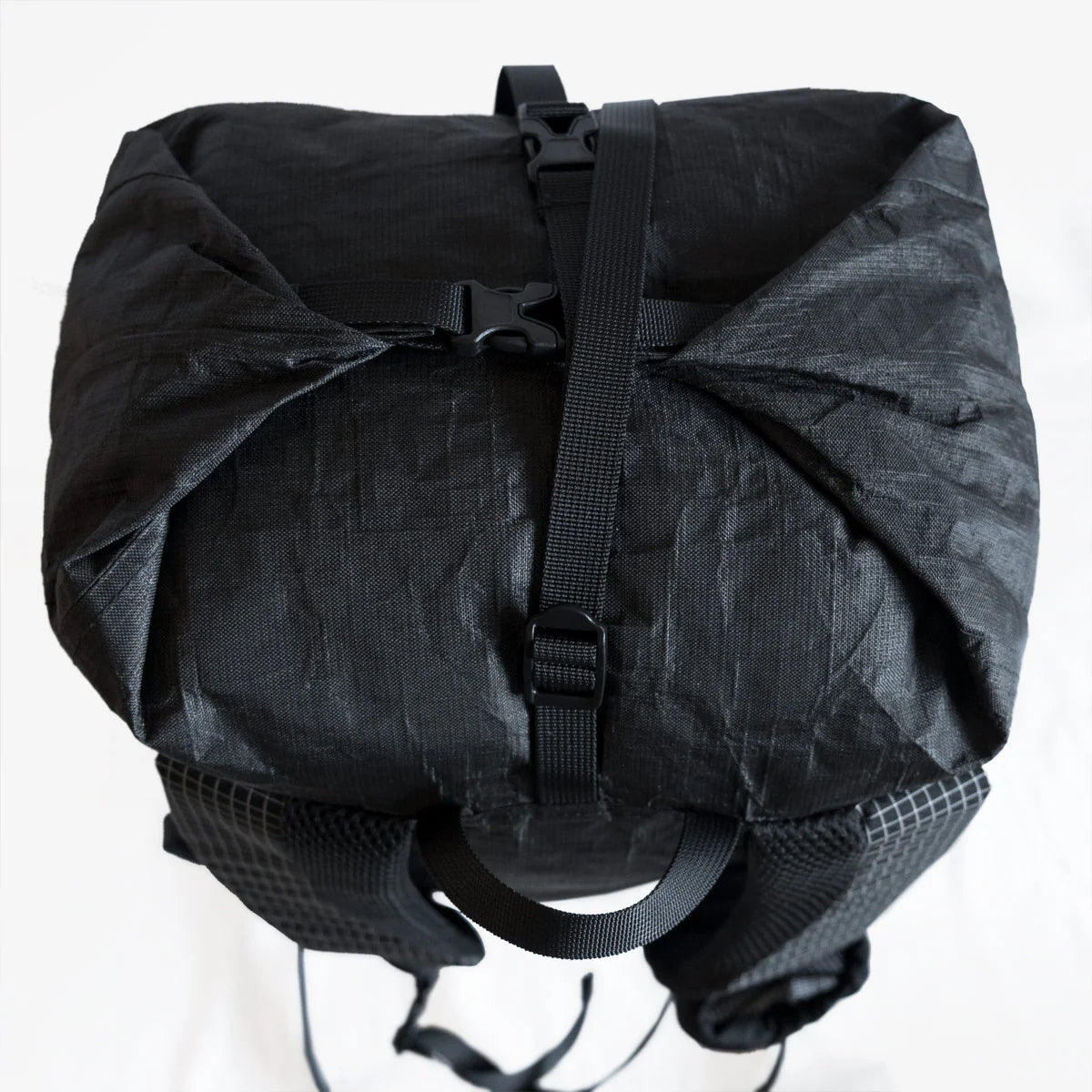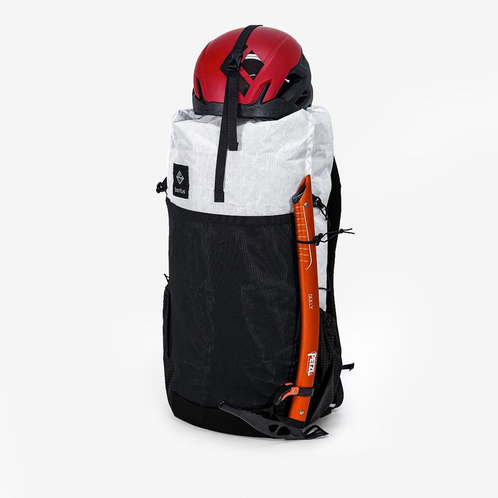 The pack is made with cutting-edge waterproof materials, resulting in an extremely lightweight and durable pack. The left shoulder harness has a highly stretchable mesh pocket, perfect for storing snacks or a smartphone. There is also a pocket at the bottom (access opening is on the right).