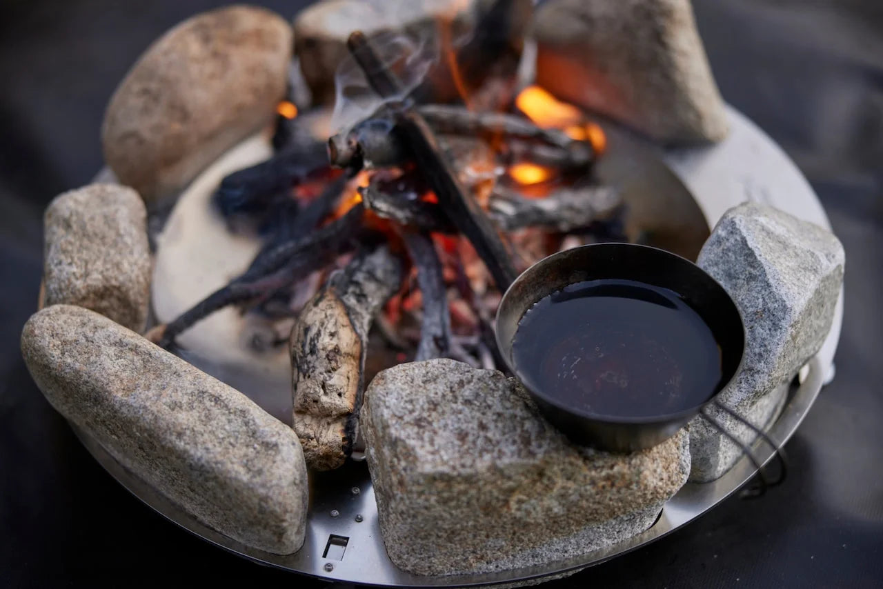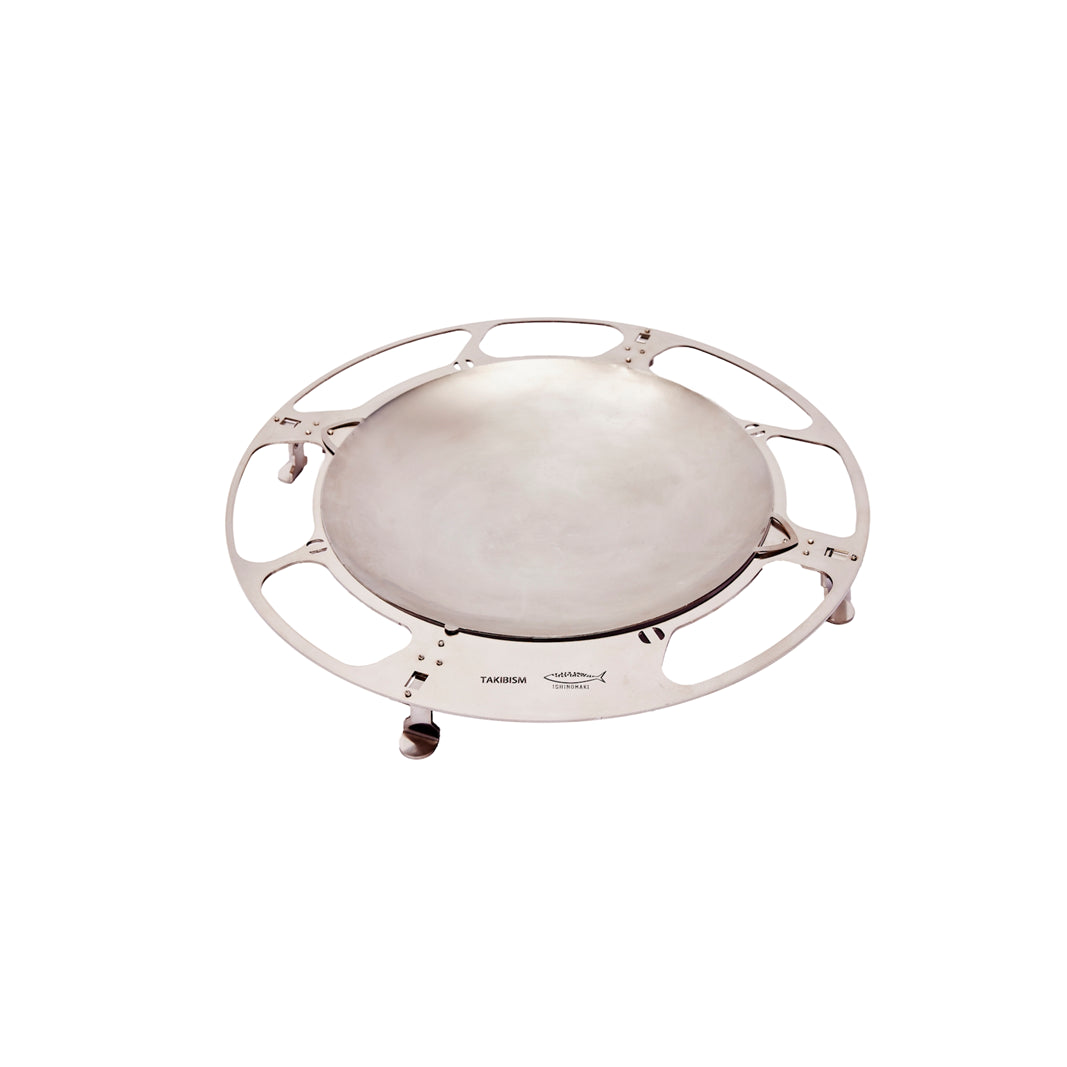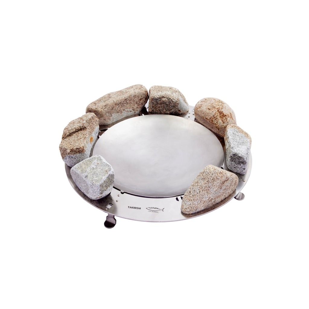 The "STONE QUEST" version of the TAKIBISM JIKABI features seven holes in the frame for fitting stones. You can freely insert your favorite stones to suit your needs and purposes, whether as a windshield or a warmer. The frame has a diameter of 47.5 cm and is made of stainless steel processed by Sanwa Kogyo in Ishinomaki City (the diameter of the stainless steel hearth plate is 33 cm, the largest in the JIKABI series), and weighs approximately 1.9 kg.