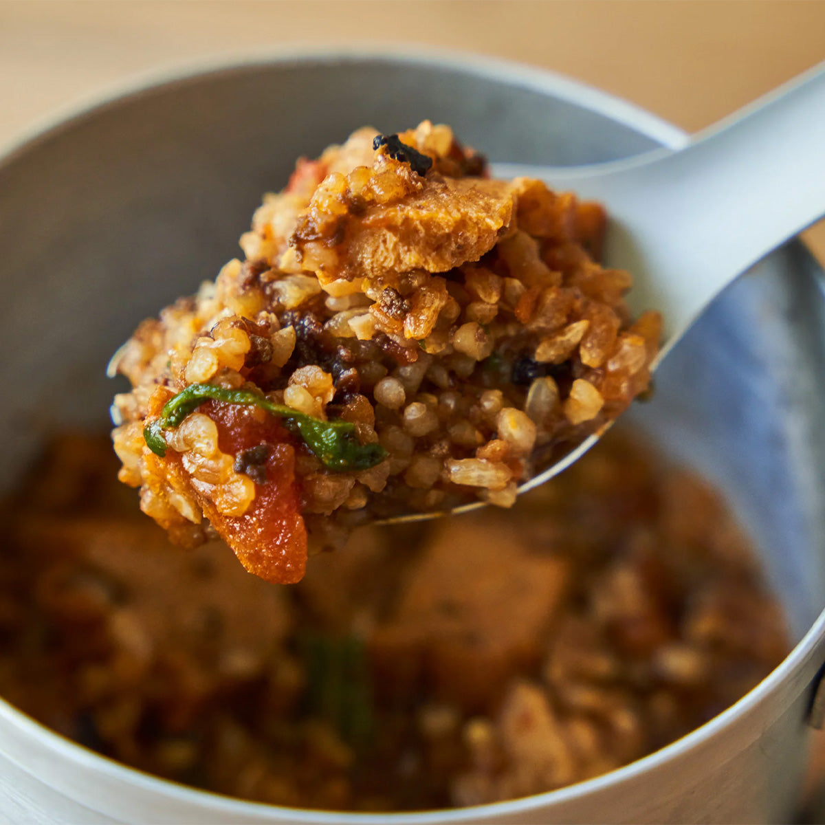 ④蓋を取り、もう一度クッカーの底からほぐすようにかき混ぜます。